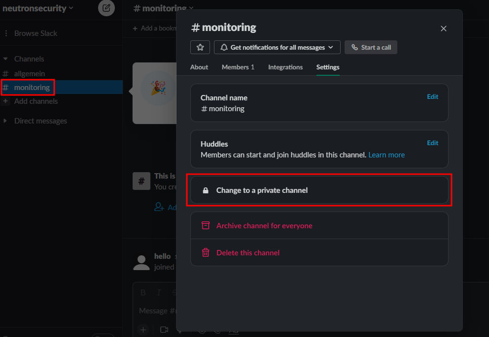 Since this is a channel for Monitoring purposes, which might contain sensitive information, we might want to switch this channel to private. For this, right click on 'Monitoring' - 'View channel details' - and click on 'Change to a private channel'.