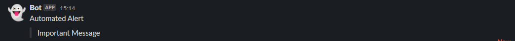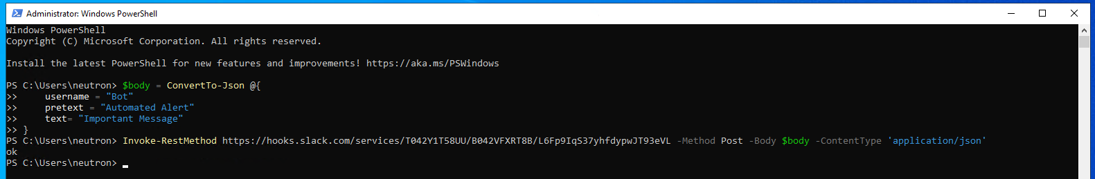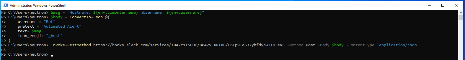 ```powershell title="The body variable" $body = ConvertTo-Json @{ username = "Bot" pretext = "Automated Alert" text= "Important Message" }
