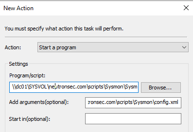 Add arguments(optional): -accepteula -i \\dc01\SYSVOL\neutronsec.com\scripts\Sysmon\config.xml
