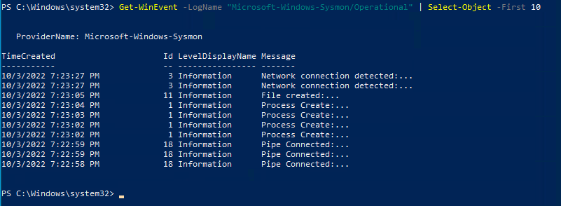 Get-WinEvent -LogName "Microsoft-Windows-Sysmon/Operational" | Select-Object -First 10